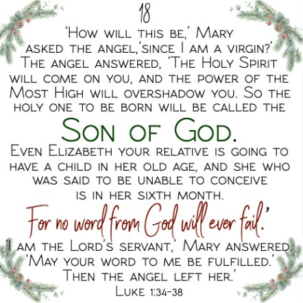 “I am the Lord’s servant,’ Mary answered. ‘May your word to me be fulfilled.’ Then the angel left her.”