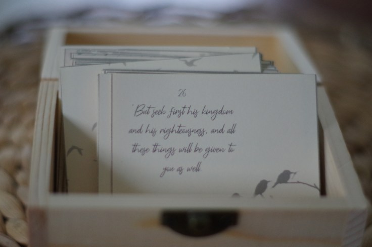 Alongside this free printable journal, I have for you some printable scripture cards that follow the same journey through the Sermon on the Mount each day. You can pin them on your refrigerator, carry them in your pocket, or display them in a treasure box as I have done.