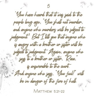 ‘You have heard that it was said to the people long ago, “You shall not murder, and anyone who murders will be subject to judgment.” But I tell you that anyone who is angry with a brother or sister will be subject to judgment. Again, anyone who says to a brother or sister, “Raca,”is answerable to the court. And anyone who says, “You fool!” will be in danger of the fire of hell.’