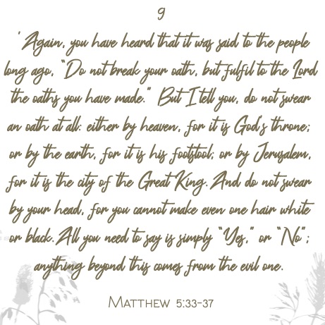 ‘Again, you have heard that it was said to the people long ago, “Do not break your oath, but fulfil to the Lord the oaths you have made.” But I tell you, do not swear an oath at all: either by heaven, for it is God’s throne; or by the earth, for it is his footstool; or by Jerusalem, for it is the city of the Great King. And do not swear by your head, for you cannot make even one hair white or black. All you need to say is simply “Yes,” or “No”; anything beyond this comes from the evil one.’