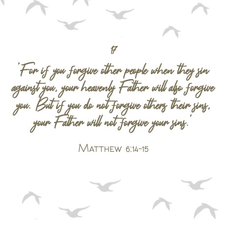 ‘For if you forgive other people when they sin against you, your heavenly Father will also forgive you. But if you do not forgive others their sins, your Father will not forgive your sins.’
