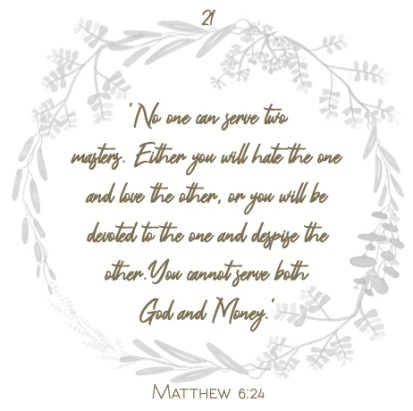 ‘No one can serve two masters.’ Either you will hate the one and love the other, or you will be devoted to the one and despise the other. You cannot serve both God and Money.’