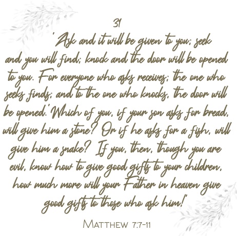 ‘Ask and it will be given to you; seek and you will find; knock and the door will be opened to you. For everyone who asks receives; the one who seeks finds; and to the one who knocks, the door will be opened.