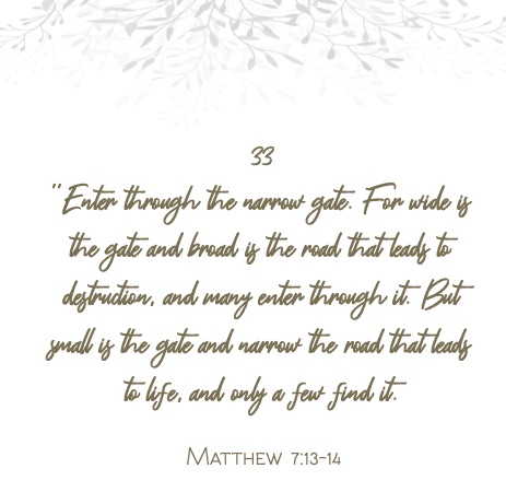 “Enter through the narrow gate. For wide is the gate and broad is the road that leads to destruction, and many enter through it. But small is the gate and narrow the road that leads to life, and only a few find it”.