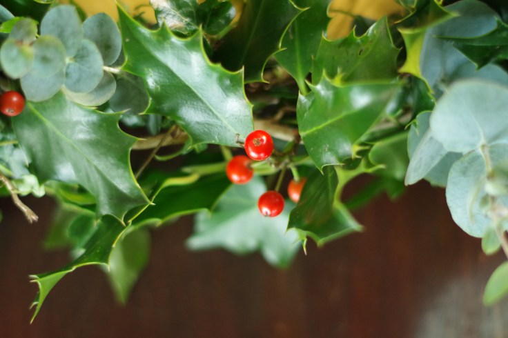 Holly is strange and exotic to me, and Australian who has lived in the Caribbean for almost two decades. Exotic and also prickly! Returning to the house with a spiky bag full of holly (via the creeping ivy which boa-constrictored its way around some of our Birch trees and my potted eucalyptus trees). I sat down at our kitchen table covering it with branchy green and began to bend, wind and weave a circle out of these handfuls of life I’d gathered, twisting it all together into a living, spiking, fragrant circle.